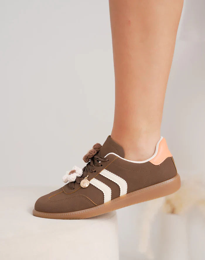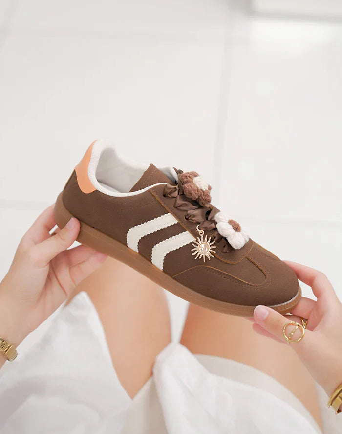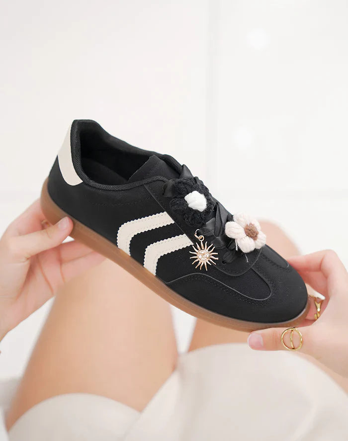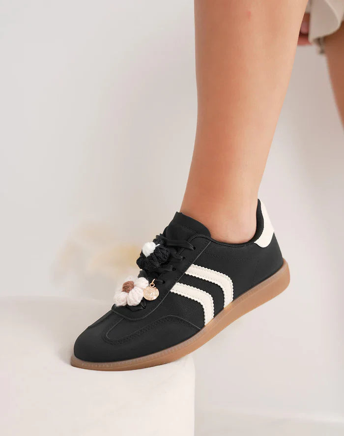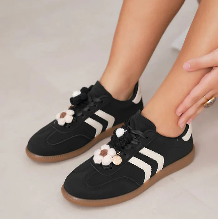 Ajoutez une touche poétique à votre look avec ces sneakers crème rehaussées de bandes bordeaux et décorées de fleurs en crochet. Un mélange unique entre l’esprit rétro sporty et l’élégance artisanale. Leur semelle gomme apporte une belle structure à cette basket douce et originale.