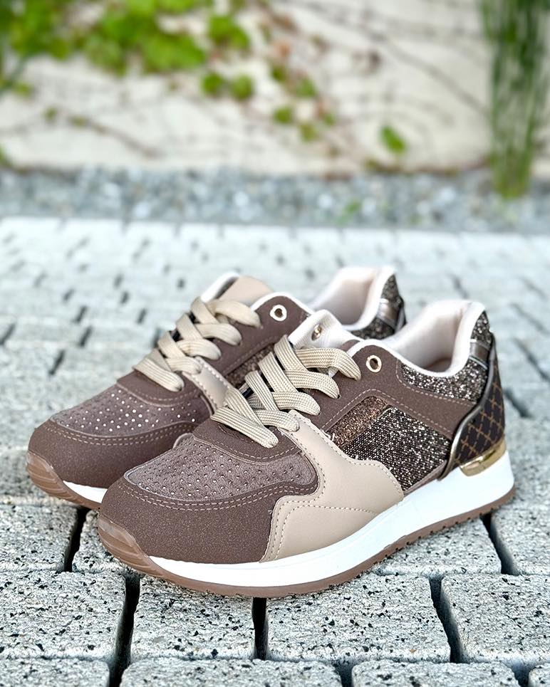 Matière : Imitation daim / Suédine (marron clair), Tissu pailleté (doré/bronze), Similicuir (blanc et marron à motif)