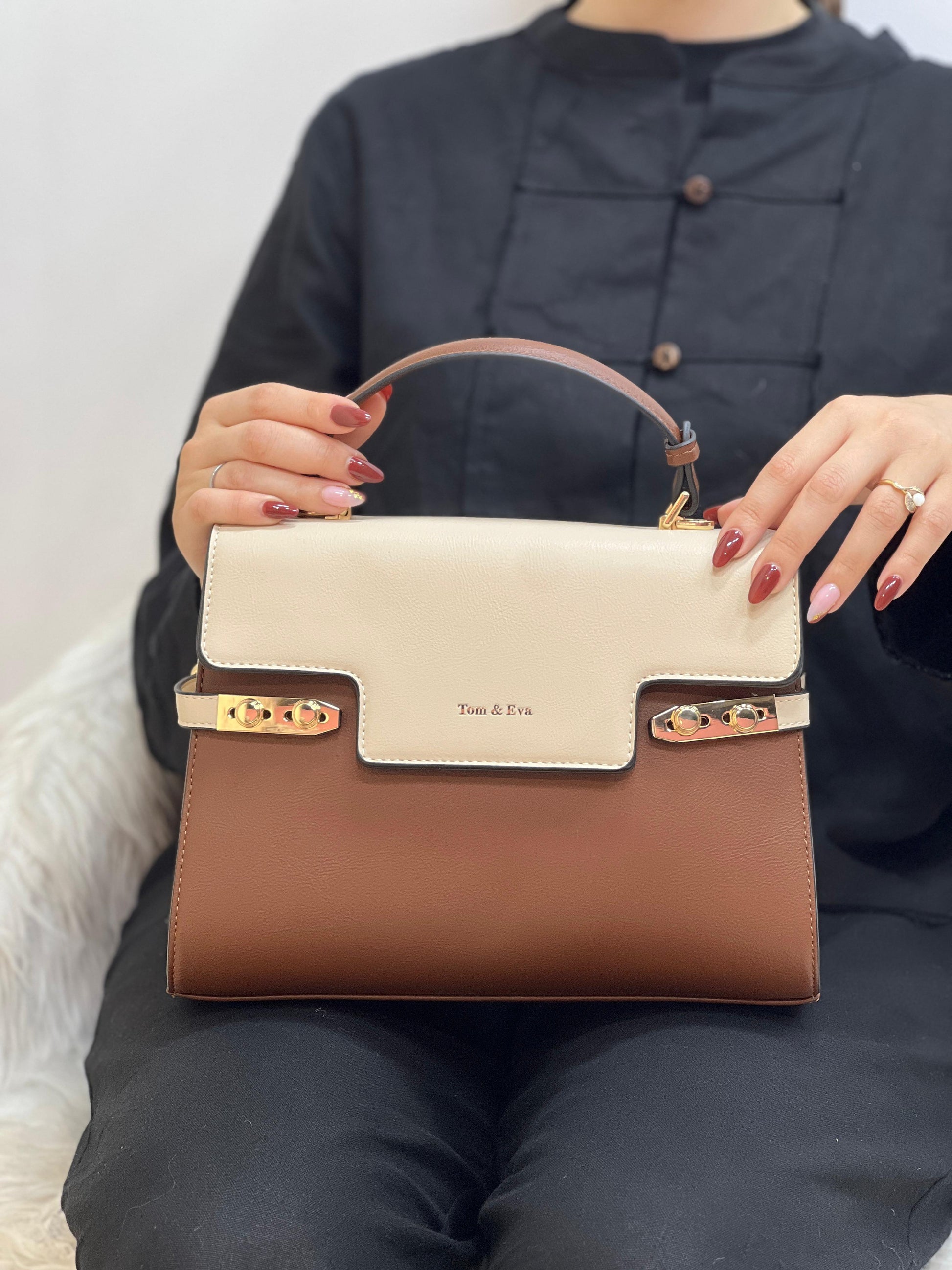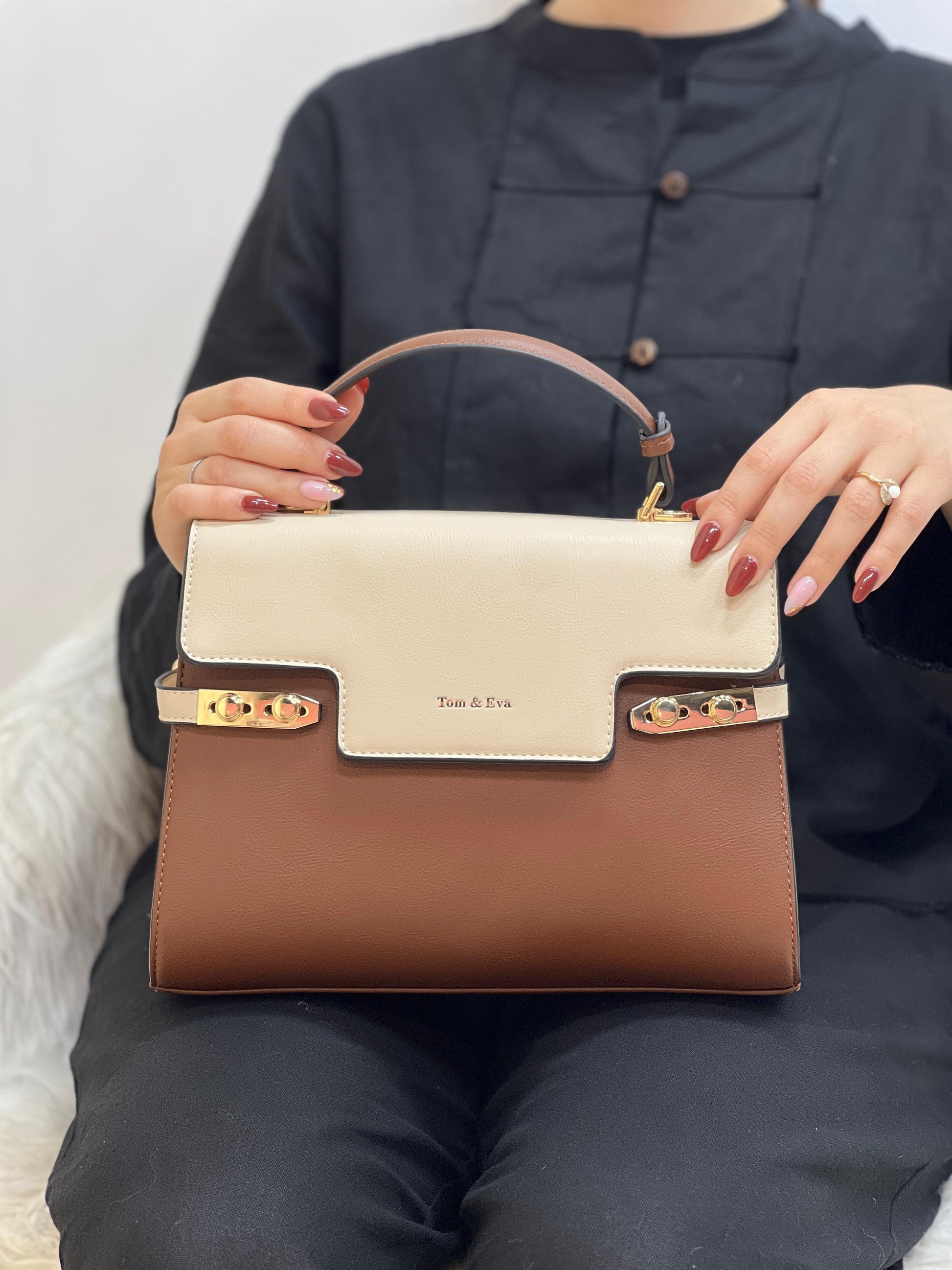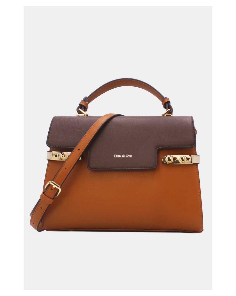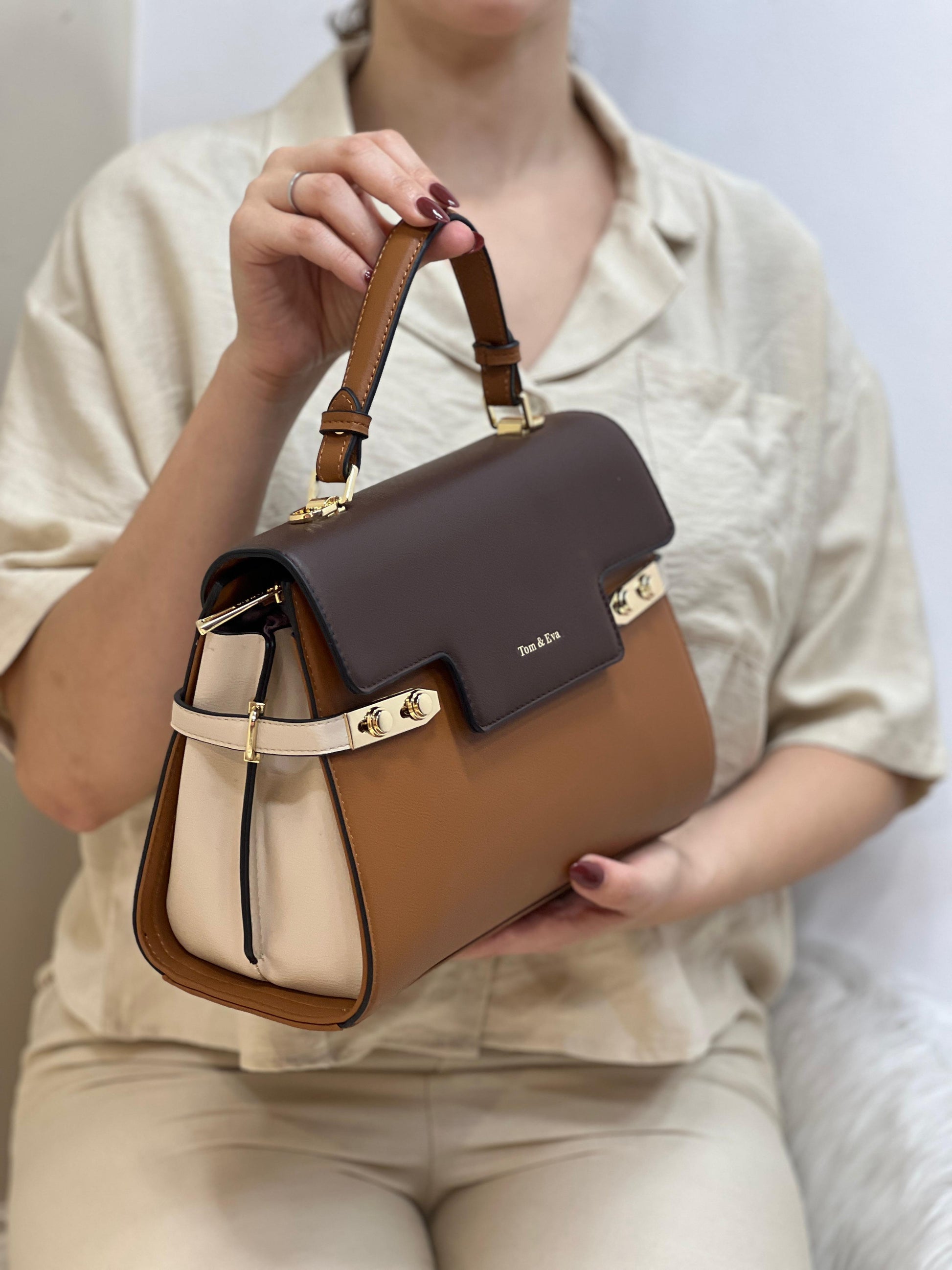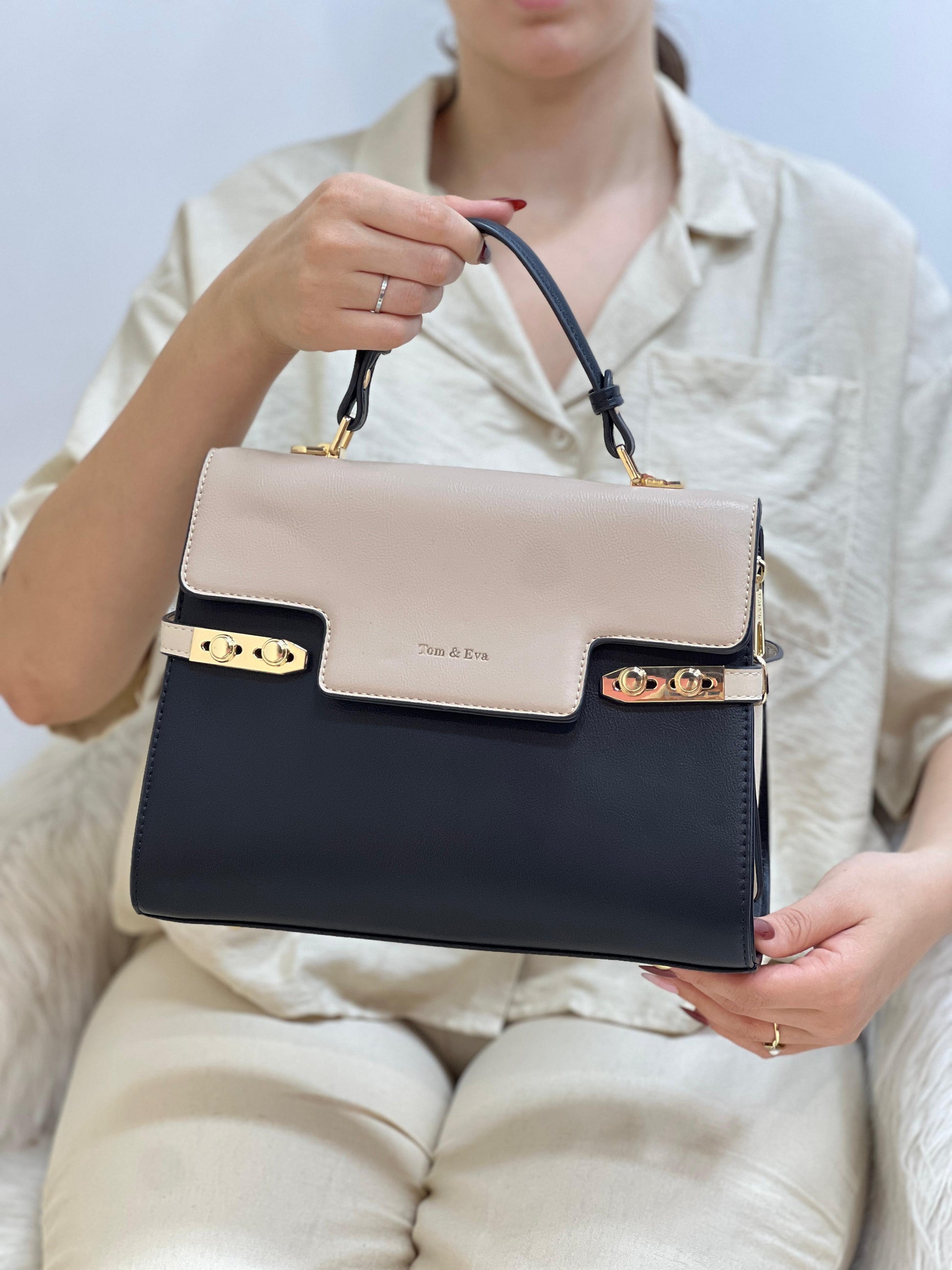 Très beau et élégant sac à main design Tom & Eva. Fabriqué en cuir écologique de haute qualité. Une belle combinaison de couleurs, un style italien et des accessoires dorés contribuent à l'aspect luxueux de ce sac à main d'été. Une bandoulière amovible est également incluse.