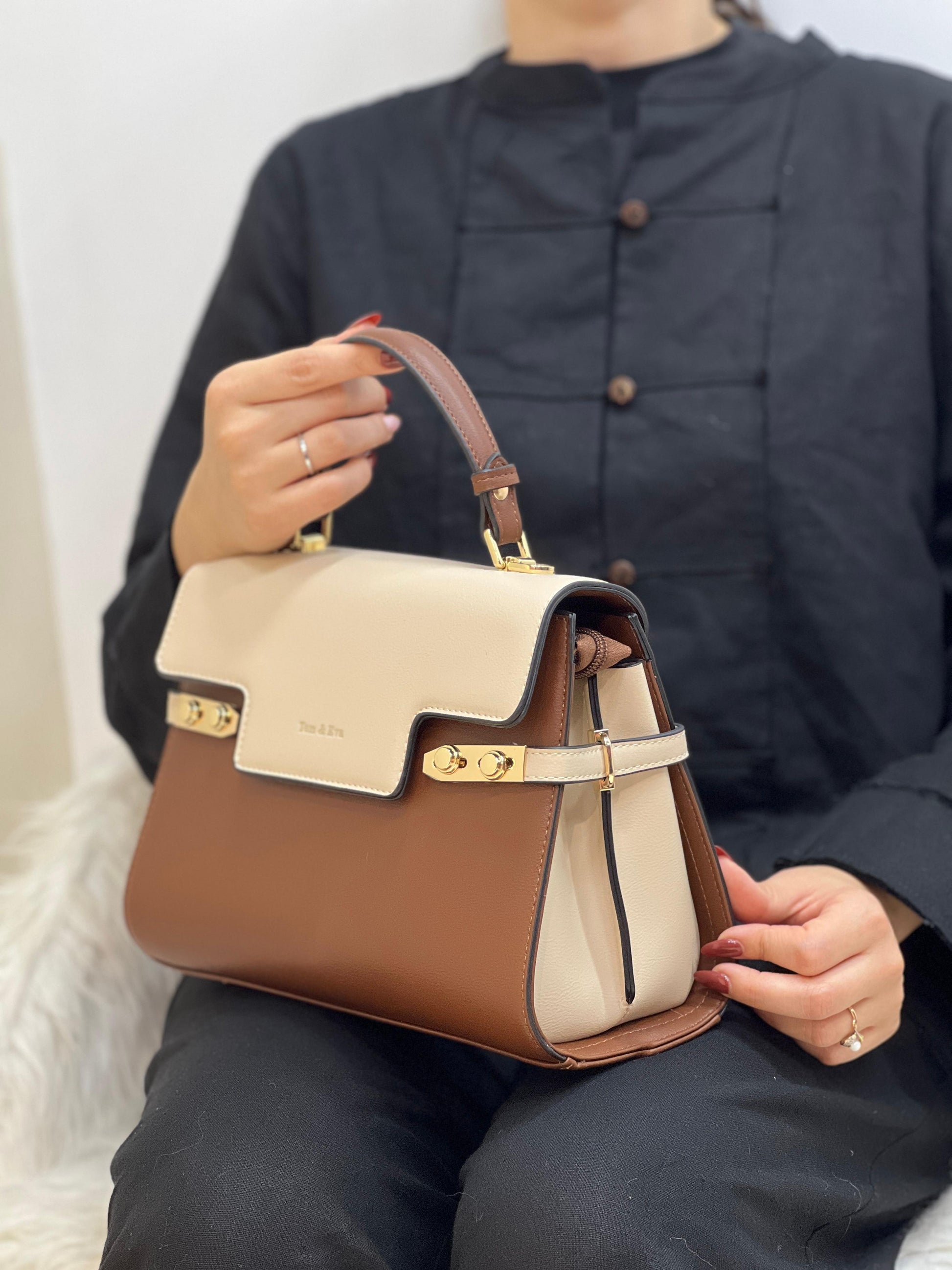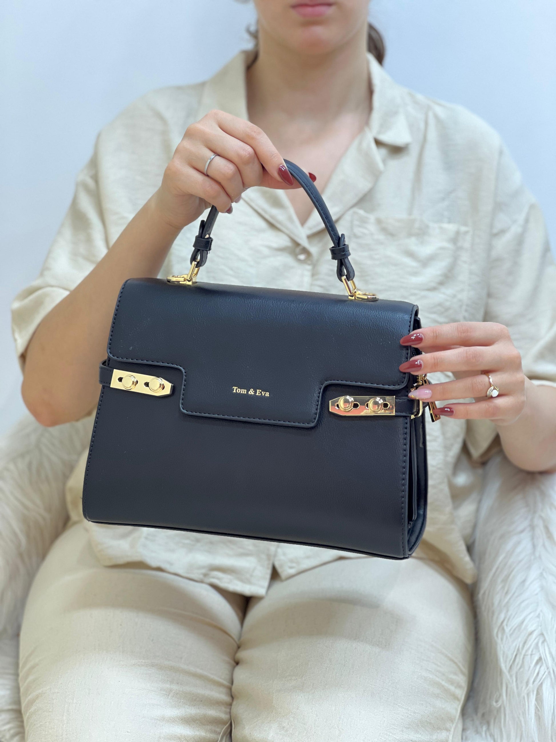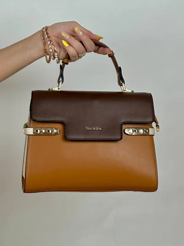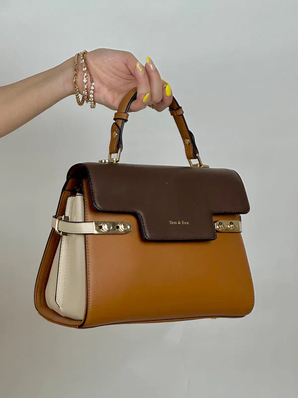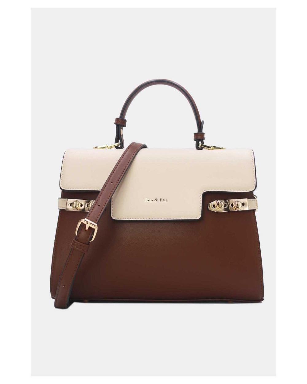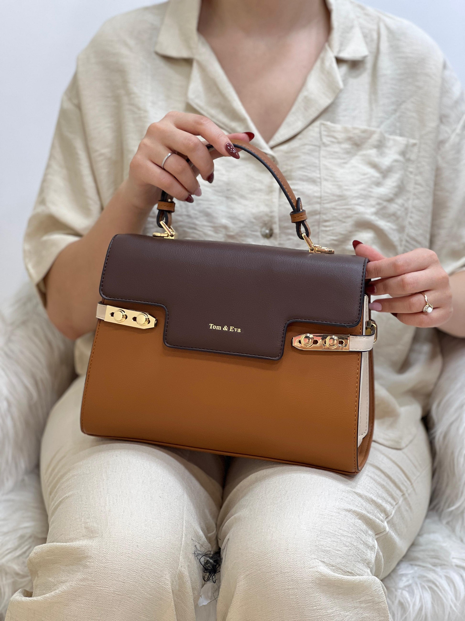 Très beau et élégant sac à main design Tom & Eva. Fabriqué en cuir écologique de haute qualité. Une belle combinaison de couleurs, un style italien et des accessoires dorés contribuent à l'aspect luxueux de ce sac à main d'été. Une bandoulière amovible est également incluse.